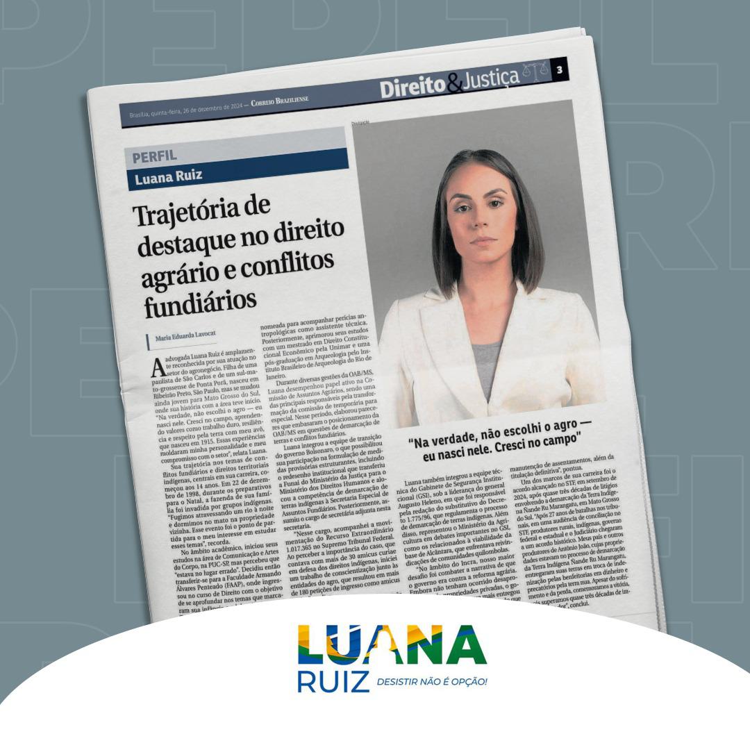 Luana Ruiz é uma das maiores referências na defesa dos direitos fundiários e agrários, atuando com firmeza e profundidade nos complexos debates sobre demarcação de terras indígenas, equilíbrio jurídico no campo e segurança jurídica para produtores rurais, perita antropológica. 1ª Suplente de Deputada Federal-MS pelo PL. Atuou como Secretária Adjunta da Comissão Especial de Direito Agrário e Agronegócio do Conselho Federal da OAB, compôs a equipe de transição do Governo Federal de JAIR BOLSONARO, foi Secretária Adjunta da Secretaria Especial de Assuntos Fundiários do Ministério da Agricultura – SEAF/MAPA, Professora e estrategista em negócios agrários.